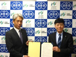 2025年(令和7年)12月9日、北海道教育庁石狩教育局にて協定締結式を執り行いました。写真は、協定書に署名後の記念撮影。写真向かって左が当社代表 野中、右が北海道教育庁石狩教育局 行徳局長。